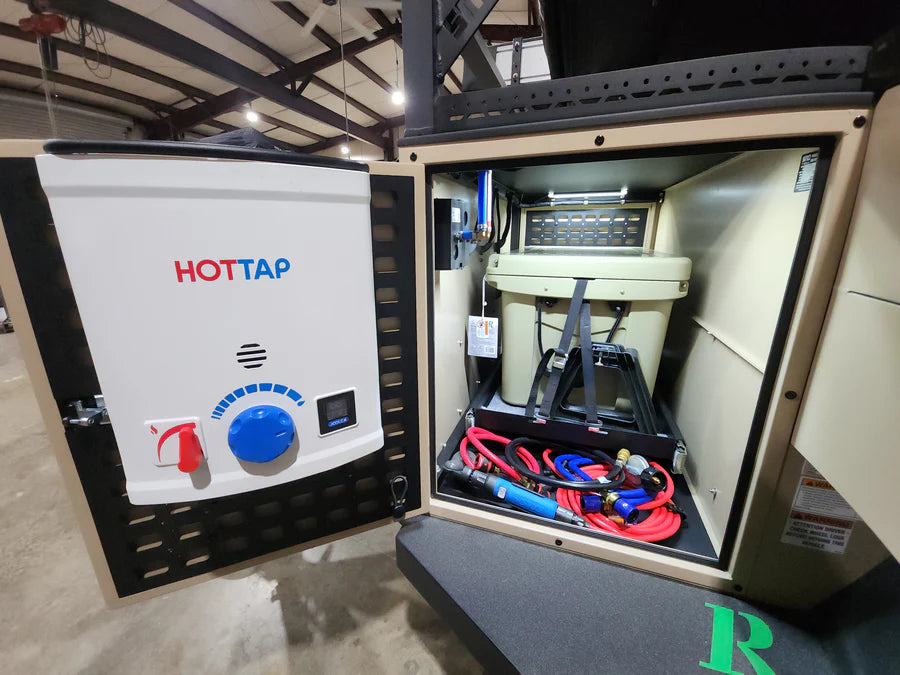 Water storage and management are key for off-grid living, and the R-12’s 15-gallon water capacity strikes a good balance between portability and practicality. With the added water heater, you can enjoy warm water for cooking or cleaning even in chilly conditions. The sink setup and plumbing integration make washing up simple and efficient with no awkward balancing acts with portable jugs.