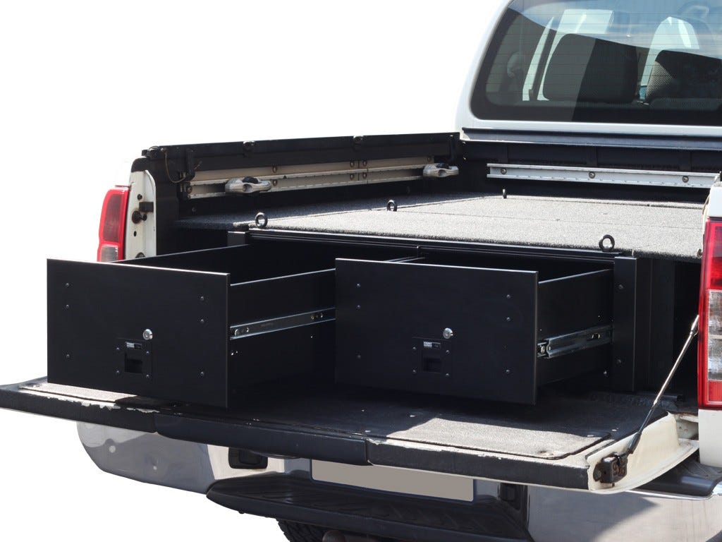 Make storing and organizing gear and valuables a no-brainer. These 2 lockable drawers with fitted deck and faceplates have been designed specifically for the Nissan Navara. Hide contents from prying eyes while creating more usable and easily accessible storage space in your vehicle.Engineered tough for both on and off-road travel.Consists of:1 x Drawer Base Unit (SSDR010)1 x Drawer System Wing Set1 x Nissan Navara Deck Completion Set2 x Push to close latch with 2 keys per lock3 x Accessory channels6 x Eye Nuts for accessory channelsInstallation Hardware includes 4 turnbuckles to secure the unitFitting InstructionMaterials used:Aluminum - Accessory Channels Sub FrameBlack powder coated steel - Drawer Bins FrameCarpet Laminated plywood - Top Deck Deck SetProduct Dimensions:1428mm (56.2) L x 1591mm (62.6) W x 300mm (11.8) HOverall Drawer Dimensions:1230mm (48.4) L x 1080mm (42.5) W x 300mm (11.8) HInterior Drawer Dimensions:Left Hand Drawer:1156mm (45.5) L x 445mm (17.5) W x 208mm (8.2) HRight Hand Drawer:1156mm (45.5) L x 445mm (17.5) W x 208mm (8.2) HWeight:90.7kg (200lbs)Load Rating:113Kg (250lbs) per DrawerThis drawer kit has 2 lockable drawers, 2 keys per lock, 3 tie down rails, 6 tie down rings, deck completion set, face completion set, brackets, all necessary installation hardware, and detailed fitment instructions. 113kg / 250 lb per drawer load carrying capacity. High-strength bearing slides allows each drawer to extend nearly 100% from the anchored base. This drawer kit can be easily installed in minutes by attaching the supplied carabiners and turnbuckles to the vehicle's existing mounting points and the drawer mounting brackets. Removing the drawers is just as easy. Provide peace of mind and security by locking away important travel items such as computers, smart phones and camera gear. The flat deck incorporates three cargo attachment channels and 6 SSCA047. Customize your own storage configurations. Stack and secure luggage, SBOX031, SBOX001, aluminum boxes and other storage containers to the top deck using STRA034 or other straps. The deck above the drawers can also be used to mount Front Runner Cargo / Fridge Slides. The left side Faceplate has 4 pre-cut knock-outs for adding electrical panel socket inserts. The right side faceplate has 2 pre-cut knock-outs for water fittings such as the WTAN037 (sold separately). The side decks are easily removable creating storage space between the drawers and vehicle for a variety of items such as tools, jumper cables, tow ropes, diving snorkels, masks, fins, kindling, barbeque skewers, etc. To create compartments within the drawers, add the optional steel SSCA050. Drawer Dividers help organize and stop excessive movement of gear and supplies. Sold in pairs, these drawers can accommodate up to 4 dividers per drawer. To create a removable box option, use SBOX001 or SBOX027 inside the drawers. The SBOX001 or SBOX027 can be used to further organize and easily move gear in and out of a vehicle. The deck is covered with a durable, UV resistant nylon pile black carpet. The nylon carpet surface creates resiliency for securing cargo while insulating against noise and vibration. Finished with the same durable black powder coating as Front Runner Roof Racks and other Front Runner products. This storage system is designed for interior use with a canopy, camper shell, or other style bed / load bed cover. All Front Runner Storage Systems are backed by a 2 year warranty.*Please Note: Cub Packs and Flatpack Storage Boxes are not included when purchasing this Drawer System and are sold separately.Note: The Deck Completion Set for this drawer kit requires modification when installed with an existing plastic load liner.